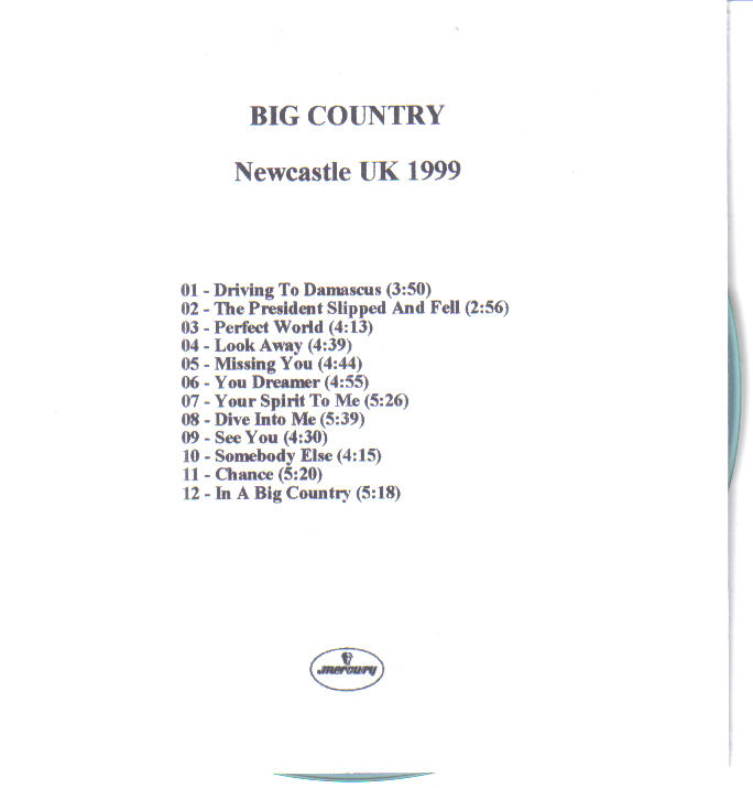 Live in Newcastle 1999, Promo of the Concert in the Newcastle City Hall, 28.12. 1999, Softcover. Driving to Damascus (3:50), The President slipped and fell (2:56), Perfect World (4:13), Look away (4:39), Fragile Thing (though it says “Missing you on the Cover? 4:44), You Dreamer (4:55), Your Spirit to me (5:26), Dive into me (5:39), See you (4:30), Somebody else (4:15), Chance (5:20), In a big Country (5:18).
