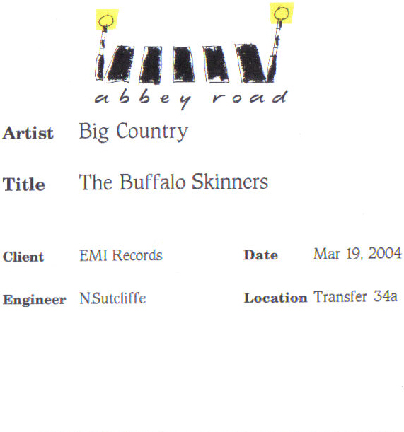 The Buffalo Skinners Test Master Remaster CD, SOLD! Client: EMI Records, mastered March 19th 2004 by N. Sutcliffe at Abbey Road Studios, London Transfer 34 a. Alone (5:11), Seven Waves (4:45), What are you working for (4:00), The One I love (5:02), Long Way home (5:56), The Selling of America (4:23), We’re not in Kansas (6:22), Ships (5:52), All go together (4:16), Winding Road (4:33), Pink Marshmellow Moon (4:24).