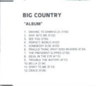Big Country Live Hits, BRILLIANT BT 33098, 2003. Live-Sampler, Made in Germany. Harvest Home (4:15), Fields of Fire (3:58), In a big Country (5:46), Chance (5:34), Wonderland (4:20), Where the Rose is sown (5:53), Just a Shadow (4:40), Look away (4:06), The Teacher (4:31), King of Emotion (6:06), Thirteen Valleys (4:55), Peace in our Time (5:24), Ships (6:07), Republican Party Reptile (4:55). Total playing Time: 69:37 Minutes.