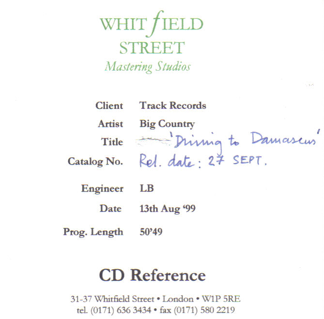 Driving to Damascus, Track Records limited Edition TRK1000CDSP, 1999. Driving to Damascus (3:56), Dive in to me (5:02), See you (3:50), Perfect World (4:02), Somebody else (4:03), Fragile Thing (4:34), The President slipped and fell (2:56), Devil in the Eye (4:13), Trouble the Waters (4:10), Bella (3:34), Your Spirit to me (5:13), Grace (5:08), Shattered Cross (4:00), Too many Ghosts (4:10). Produced by Rafe McKenna and Big Country.