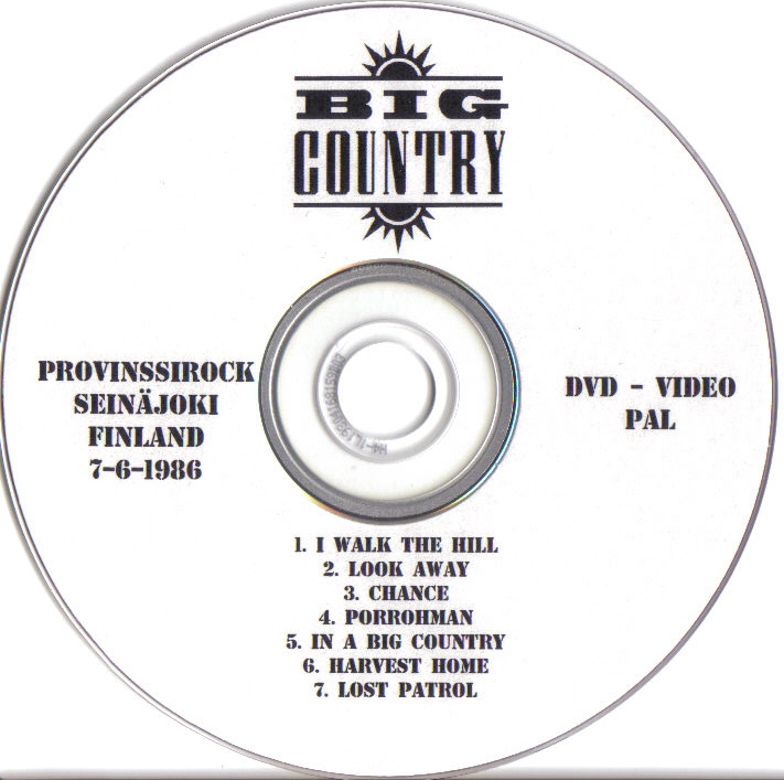 Provinssirock Seinajöki Finland DVD PAL Colour, 7.06.1986: I walk the Hill, Look away, Chance, Porrohman, In a big Country, Harvest Home, Lost Patrol.